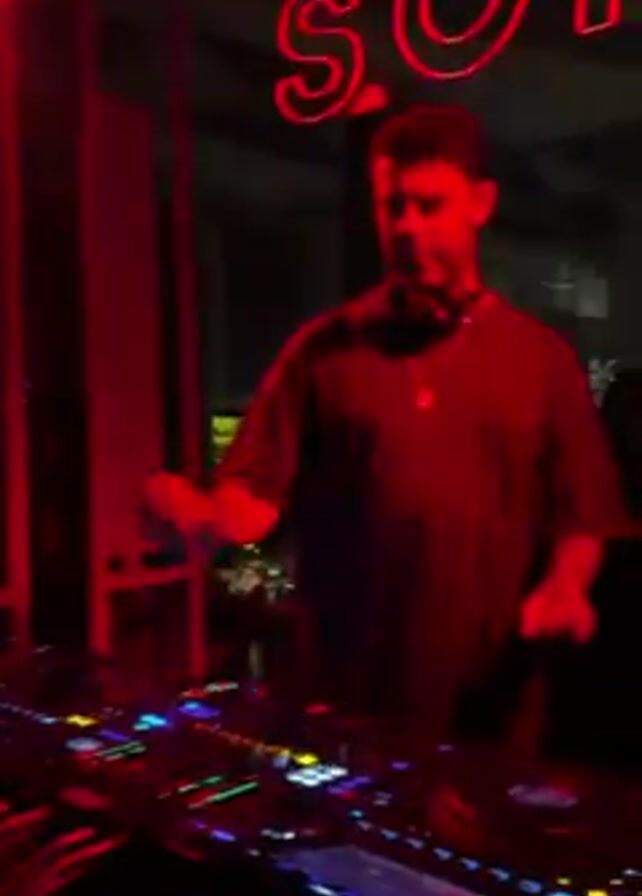 A DJ plays music in a nightclub, with the lights flashing from red to blue. A woman takes a selfie and appears to be dancing in the background. A neon sign behind the DJ reads "SO."