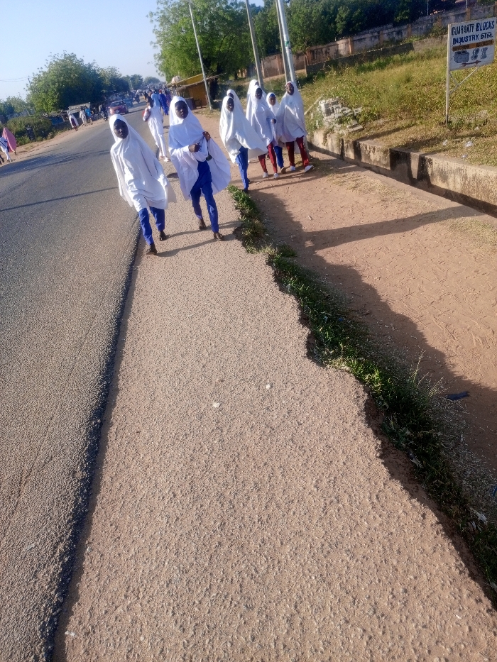 A group of girls in white hijabs and blue pants walk along a road and path. The paved road meets a dirt path separated by grass. More people are visible down the road, and a sign reads "GUARANTY BLOCKS INDUSTRY." Green trees and grass surround the area. The sun is shining brightly.