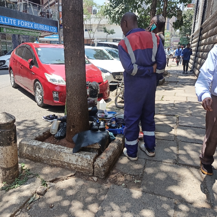 The image captures a daylight street scene in Nairobi, Kenya, on a paved sidewalk with a visible "Satellite Forex Bureau Ltd" sign across the street, indicating a central business district location