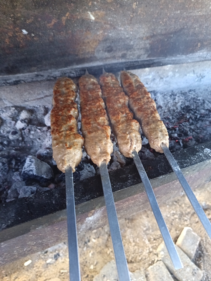 - "Four skewers of elongated, raw to partially cooked ground meat, likely kebabs, are positioned horizontally over glowing charcoal and ash in a metal brazier" by FM-a8p7q1, licensed under CC BY 4.0