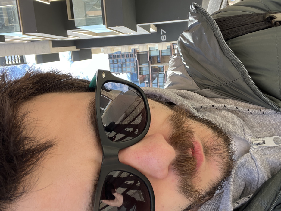 A male individual is depicted in a close-up selfie, primarily showing his face from the upper chest to the forehead