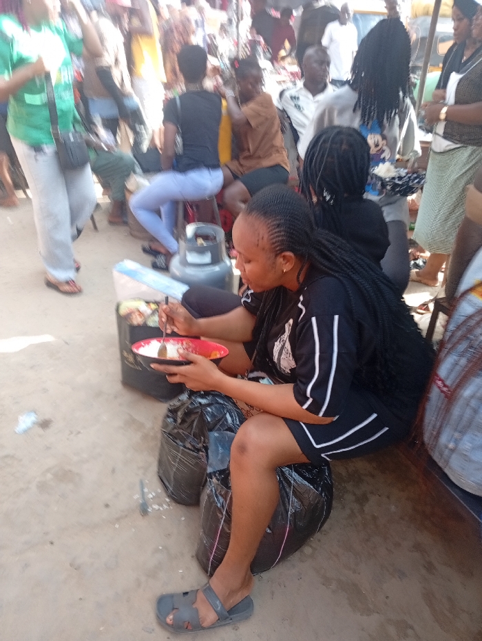 The image depicts an outdoor, daylight scene in Fegge, Nigeria, displaying a crowded urban environment. In the foreground, a female individual with dark braided hair, wearing a black shirt with white arm stripes and black shorts, is seated on two large black plastic bags. She holds a black bowl with a red rim, containing white rice and a reddish sauce, actively eating with a fork. She wears grey slide sandals. Dispersed on the light grey concrete ground directly in front of her are several grains of white rice and a metallic fork. A grey gas cylinder is visible to the immediate left of the seated female. The midground and background are densely populated with numerous other individuals, both standing and seated on various stools or benches. Notable figures include a person with braided hair wearing a light grey t-shirt featuring a 'Mickey Mouse' graphic, a person in a black t-shirt and light blue jeans seated on a short stool, and a person in a green t-shirt carrying a black shoulder bag. The distant background is significantly blurred, indicating a bustling market or street vendor area with indistinct structures and activities.