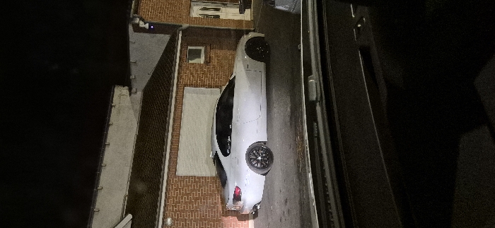 An overhead shot shows a white car parked between a brick house and a dark gray wall. The car appears to be in a tight space, with minimal clearance on either side. A small window is visible in the brick wall. It's nighttime, as indicated by the darkness surrounding the scene. The image seems to be taken by a drone or from a high vantage point.