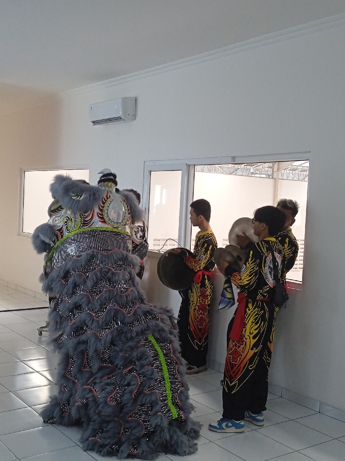 An indoor scene in Semarang, Indonesia, shows a lion dance group preparing or paused during a performance