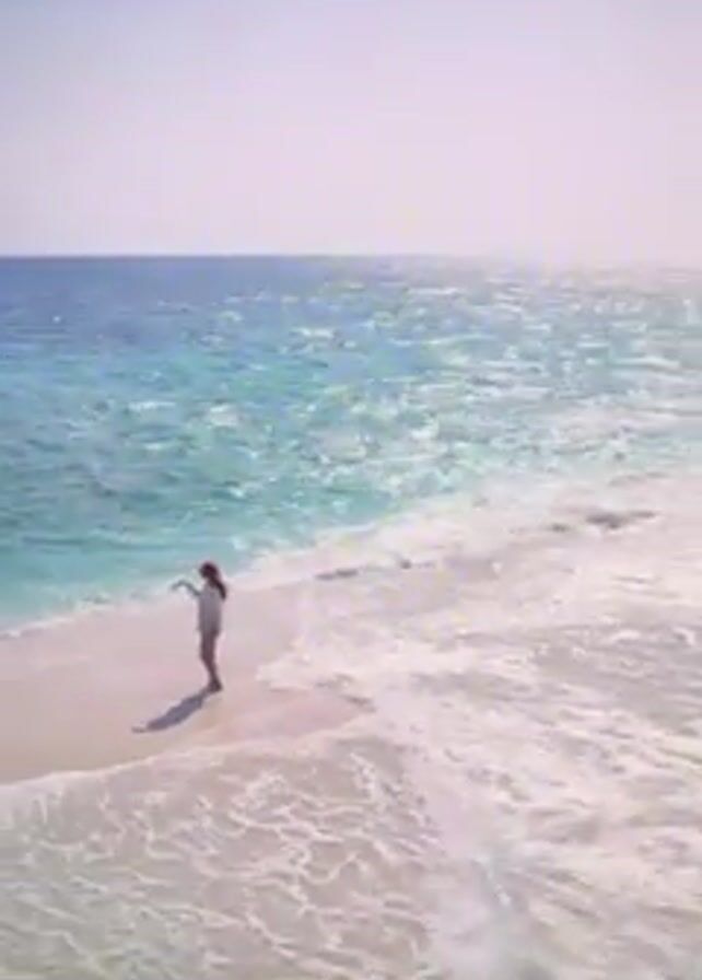 A woman in a white shirt and a red hat stands on a white sand beach next to a blue ocean. She raises her hat up in the air and appears to be celebrating. The sky is bright and clear. There is music playing.