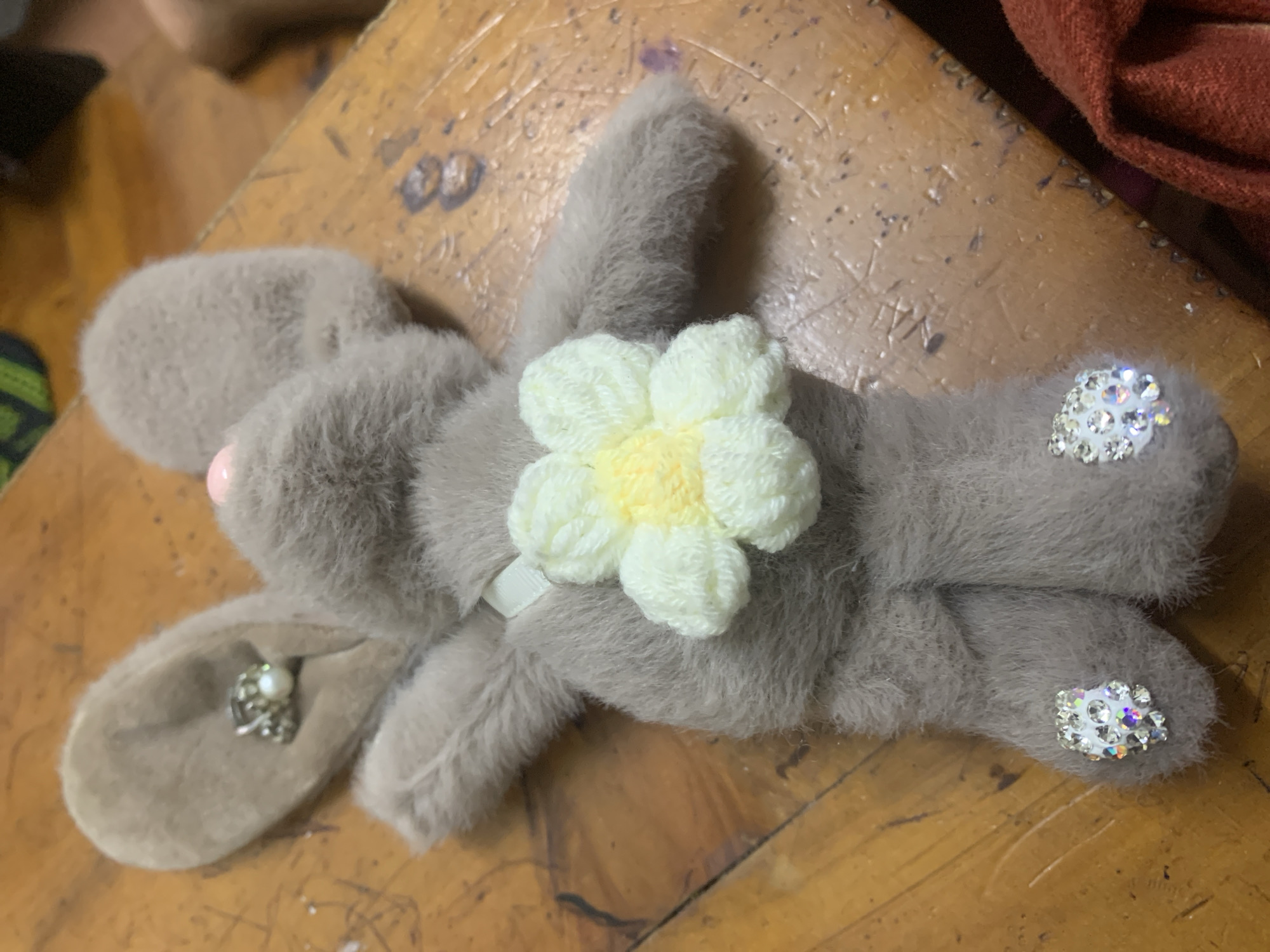A gray, stuffed rabbit toy rests on a wooden surface. The rabbit has a pink nose and a white and yellow crocheted flower attached to its chest. Small, decorative jewels are affixed to its ears and feet. The wooden surface appears to be a table or countertop. The image was taken indoors. The location is not deducible from the image content.