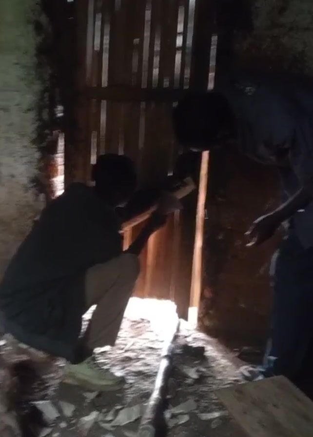 Two people are inside a dark, derelict room. One is squatting down and hammering on the edge of a rickety wooden door. The other is standing and appears to be watching the first person. The room is cluttered with debris, including what looks like a log and a metal rod. The door is the only source of light in the room.
