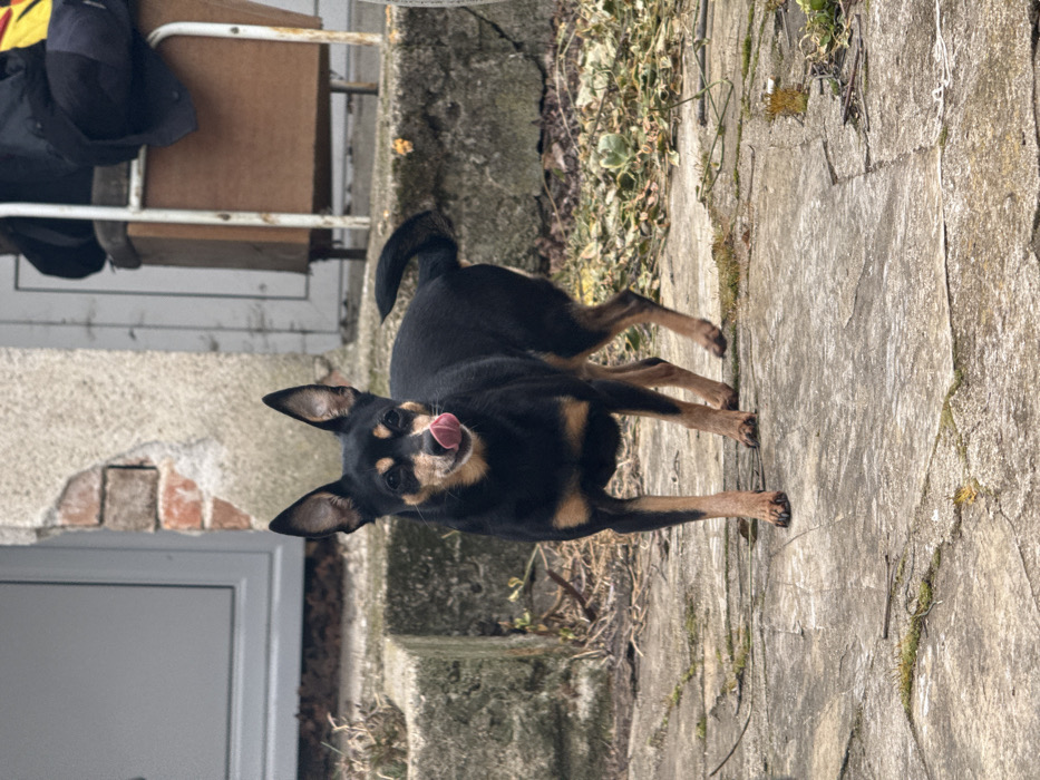 - "The image depicts a small, black and tan dog, consistent with a Miniature Pinscher or similar terrier breed, standing on a cracked concrete slab path in an outdoor area of Liaskovo, Bulgaria" by FM-js4Rz2, licensed under CC BY 4.0