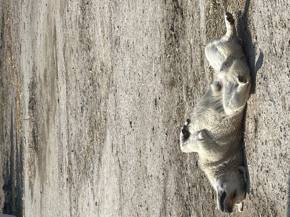 The scene depicts an outdoor environment in Bliznatsi, Bulgaria, characterized by a dry, unpaved ground surface consisting of light brown soil, gravel, and sparse, dried straw or hay fragments. A single subject, a large, light-furred canine, is observed in a supine position. The dog lies on its back, with its head tilted to the left, eyes appearing closed or partially closed. Its forelegs are bent at the elbows, with paws resting near its chest. Its hind legs are splayed, one bent with the paw visible, revealing a reddish-pink patch on its lower abdomen or inner thigh area. Sunlight illuminates the scene from the right, casting shadows from the dog onto the ground.