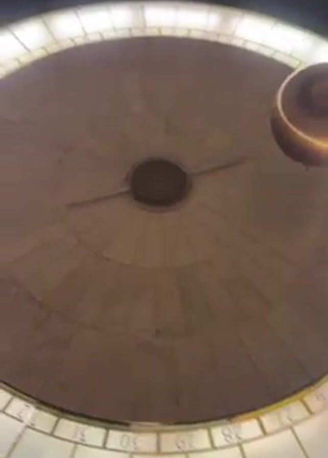 A video shows a Foucault pendulum hanging from the ceiling. The pendulum consists of a metal ball suspended by a cable. The camera is positioned below the pendulum, looking up at it. The pendulum swings in a steady arc. Below the pendulum is a circular surface divided into sections. A scale is displayed around the circumference of the circle. The video is shot indoors under artificial lighting. The background is out of focus, but people can be heard speaking.