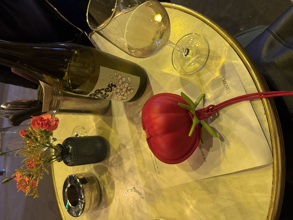 The image displays an overhead view of a small, round cafe table with a light-colored, possibly marble, surface and a golden rim. A red, tomato-shaped purse or coin pouch with green stem-like details and a red strap rests on a white paper menu, which features text including "DIGESTIF 10€" and "MENU". To the right, a dark green glass bottle, partially full of a light-colored liquid, likely white wine, stands next to a stemmed wine glass containing a small amount of the same liquid. In the upper left quadrant, a small, dark teal, textured glass vase holds several orange-red flowers and dried foliage. Adjacent to the vase is a metallic, lidded ashtray. A cylindrical metallic holder containing cutlery (knives, forks) is positioned behind the vase and to the left of the wine bottle. Small liquid splatters are visible on the table surface. The background is dark and out of focus, with a dark clothing item visible at the bottom right edge. The arrangement of objects and table style suggests a typical cafe or restaurant setting in Paris, France.