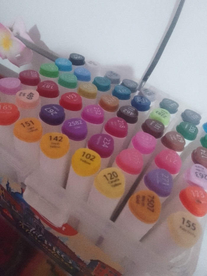 A collection of markers, neatly arranged in a container. Each marker has a colorful cap with a unique number and, in some instances, a color name printed on it, like "102 Yellow" or "2582 Violet". The color palette includes shades of orange, pink, purple, yellow, green, and blue. The arrangement is such that the viewer can discern the individual markers and their corresponding codes.