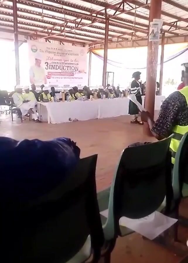graduation ceremony inside a building. At a long table covered with a white tablecloth, a group of people are seated and facing forward. In front of them are water bottles and papers. A person in academic regalia is standing up and speaking, while another person in a construction helmet and reflective vest is seen in the right foreground. There are empty chairs in the foreground, and a banner behind the seated group reads "The Nigerian Society of Engineers, Welcome you to the Graduate Membership 3rd Induction". The building has a metal roof and support columns. The floor is concrete.