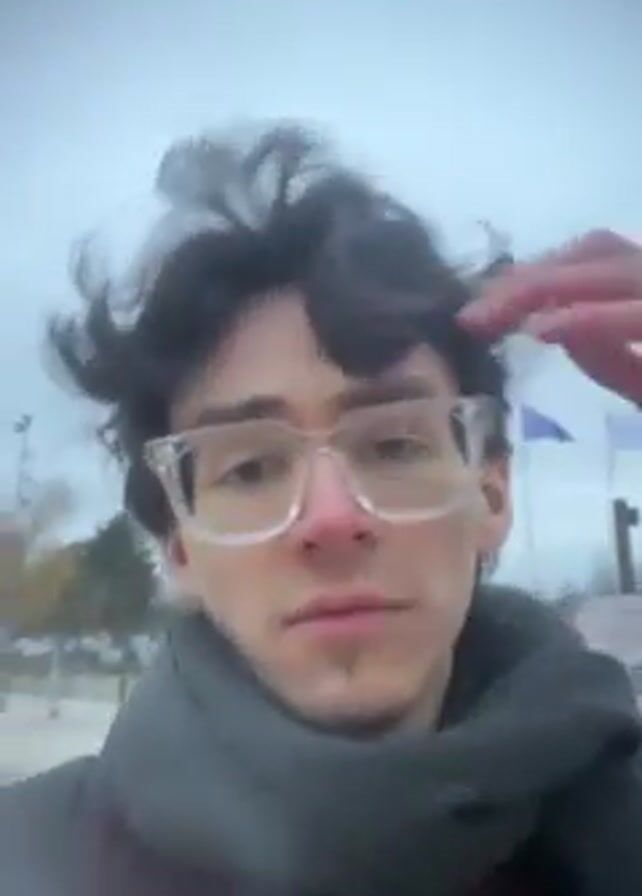 person with dark hair, fair skin, and clear-framed glasses standing outside on what appears to be a windy day