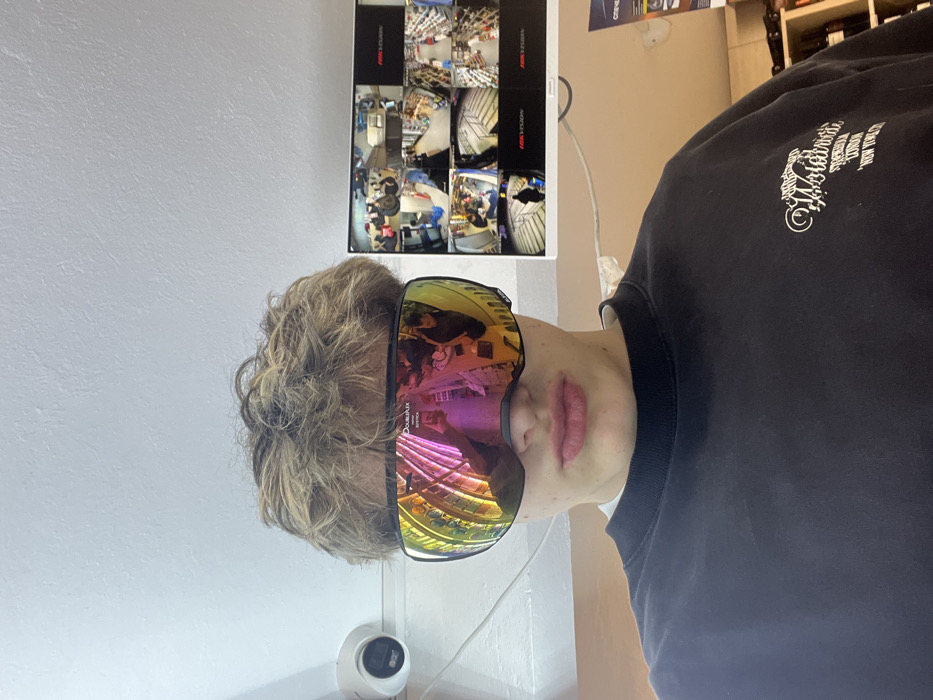 A young male is depicted from the chest up in an indoor commercial setting within the city of Silistra, Bulgaria. He has light brown, wavy hair and wears large, iridescent pink and yellow mirrored goggles that obscure his eyes. The goggles feature the text "DOUBLIFLEX" and "SYSTEM HORNICA". His lips are slightly parted, revealing a pink hue. He wears a dark, crew-neck sweatshirt with white, stylized text on the left chest that reads "Worldwide STOCKHOLM LONDON NEW YORK". The individual is centered and looking directly forward, posing for the photograph. In the upper left background, a white dome-shaped security camera is mounted on a light-colored wall. To the right of the subject, a flat-screen monitor displays a 3x3 grid of security camera feeds, some labeled "HIKVISION", showing various interior views of what appears to be a retail establishment, including aisles, counters, and a staircase. Below the monitor, a white cable hangs, and a partially visible sign with Cyrillic text, beginning "СПЕЦИАЛ", is present. The ceiling is white, and the walls are a light beige.