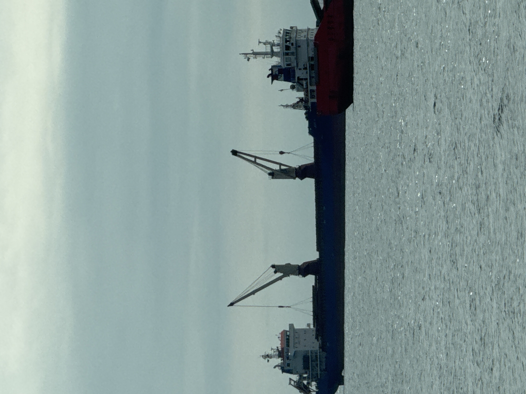 two cargo ships in the water, likely at the port of Varna, Bulgaria. Each ship has visible cranes. The sky is overcast. The water surface has visible ripples. One of the ships is partially red. The image is vertically oriented.