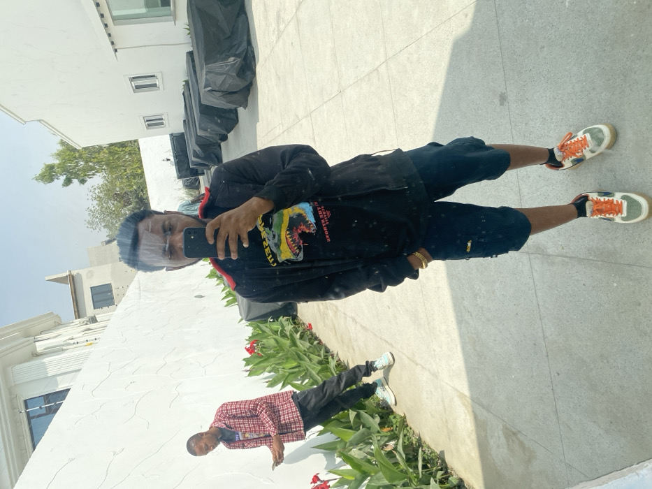 The image portrays an outdoor daytime scene in Giginyu, Nigeria, featuring two male individuals on a light-colored tiled surface. The primary subject, a male in the foreground, holds a dark-colored smartphone directly towards himself, appearing to take a selfie. He wears a black zippered jacket over a black t-shirt with a multi-colored graphic design, dark blue cargo shorts, and light-toned sneakers with prominent orange laces. A gold-colored bracelet is visible on his left wrist. Behind and to the left of the primary subject, a second male individual stands leaning against a white wall. This individual is dressed in a red and white plaid long-sleeved shirt, dark trousers, and light blue sneakers, and is engaged with a white smartphone held in both hands. Along the base of the white wall, a planter contains green foliage interspersed with red flowers. In the background, two modern white multi-story buildings are visible, with green trees beyond them. To the right of the frame, a series of rectangular objects, possibly furniture or equipment, are covered with black tarpaulins and arranged in a row on the paved ground. Strong shadows indicate bright sunlight.