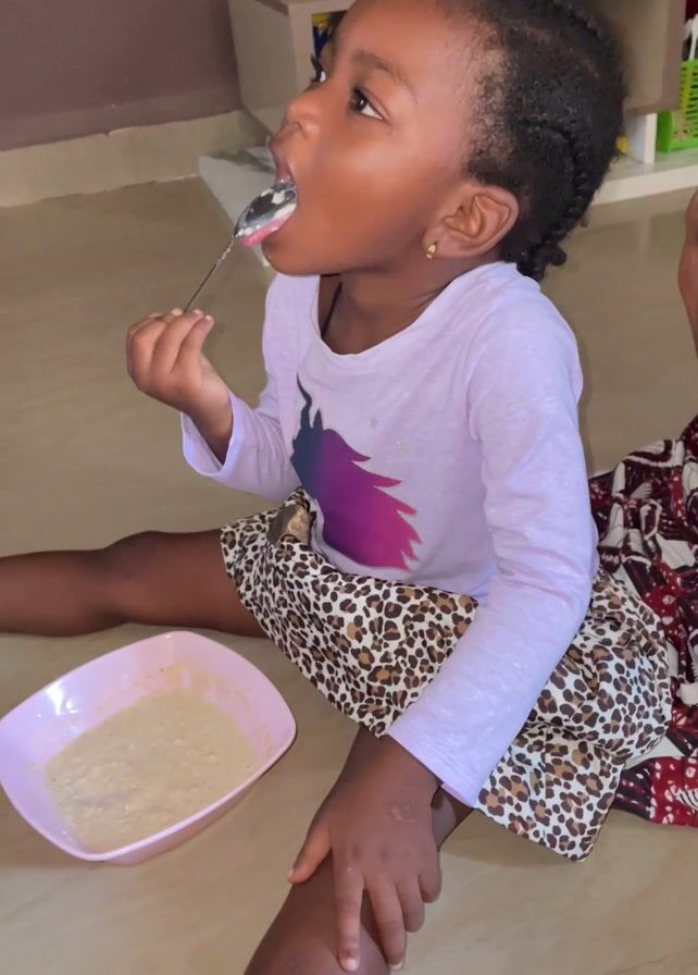 A young, brown-skinned girl with braided hair sits on the floor with her legs spread. She wears a long-sleeved purple shirt with a colorful graphic on the front, and a brown and black animal print skirt. She holds a spoon and eats from a pink plastic bowl containing a light-colored, porridge-like substance. A person's leg is visible to the right of the girl, wearing a long printed skirt. The floor is beige tile, and in the background, furniture can be seen, including a white shelf unit and a brown box. The girl is looking away as she eats.