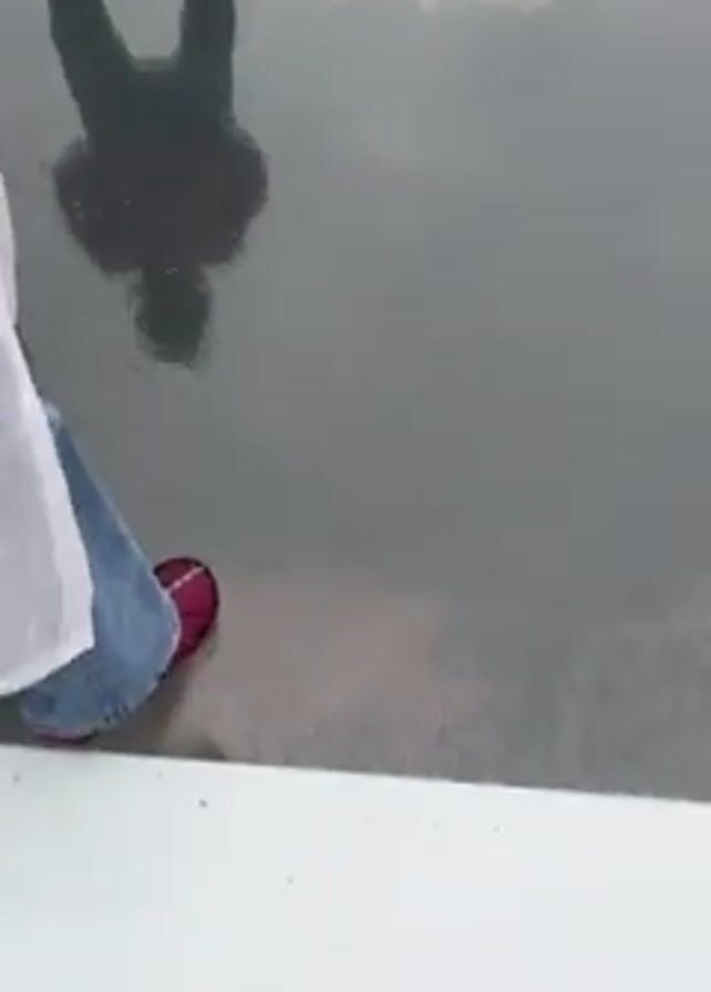 group of people walking on a glass bridge or platform. The people are wearing shoe coverings. The video pans down to show the drop below. Reflections of the people are visible on the glass surface. The environment appears to be an outdoor observation area.