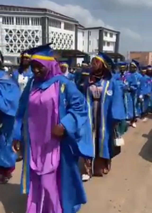 A group of people in blue graduation gowns and caps are walking on a street. The majority of the group is wearing the graduation attire over regular clothing, while one woman in the foreground wears a pink dress underneath. Several people are visible in the background behind the group. There is a large building in the background on the left side of the frame. The sky is partly cloudy and sunlight is visible.