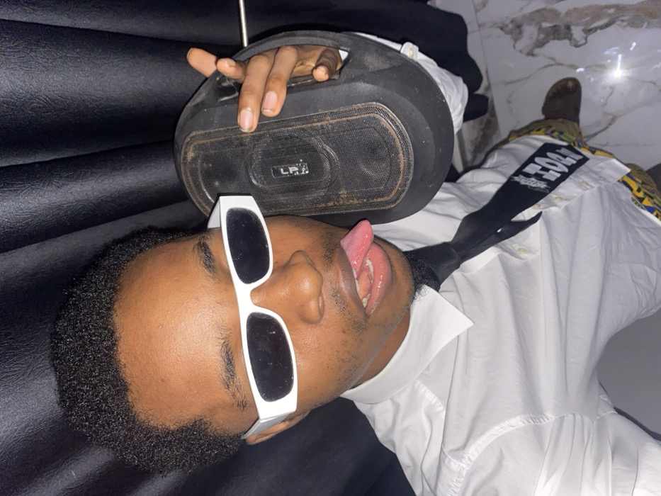 A man wearing large white-framed sunglasses lies on his back, sticking out his tongue with his mouth open. He is holding a black boombox speaker over his head with one hand. The man is wearing a white collared shirt and black tie. Part of his leg is visible in the upper right corner. He is on a black surface or couch. The background appears to be a tiled floor.