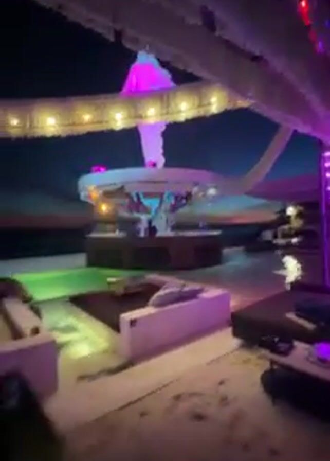The video begins with a wide shot of a luxurious, modern-looking outdoor bar at night. The bar area includes lounge beds, a DJ booth, and decorative lighting. The camera then shifts, focusing on two young women wearing bikini tops, one in black and the other in pink. They are smiling and dancing in what appears to be the bar area, with other people visible in the background. The bar has a unique ceiling design made of bundled wood and is lit with purple and red lights.