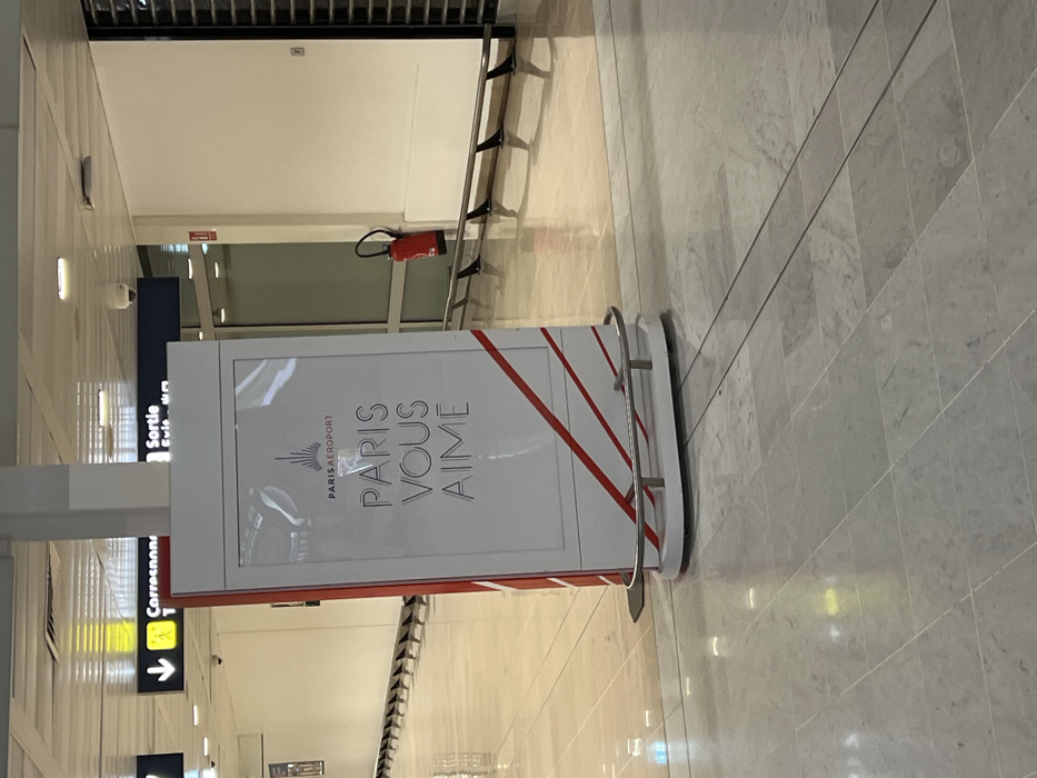 An airport interior features a sign that reads "PARIS AEROPORT PARIS VOUS AIME
