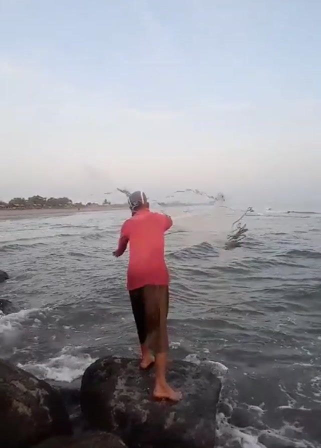 - "A man is standing barefoot on a large rock on a beach, preparing to cast a fishing net into the ocean" by FM-hcL462, licensed under CC BY 4.0