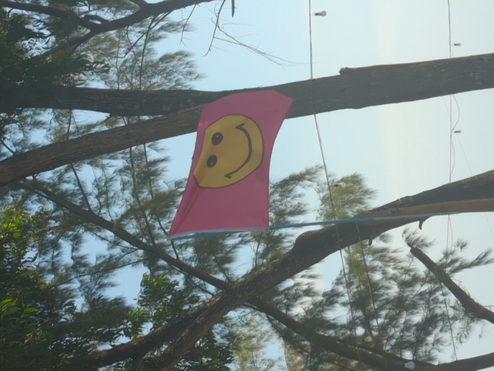 A pink flag bearing a yellow smiley face hangs from a tree branch