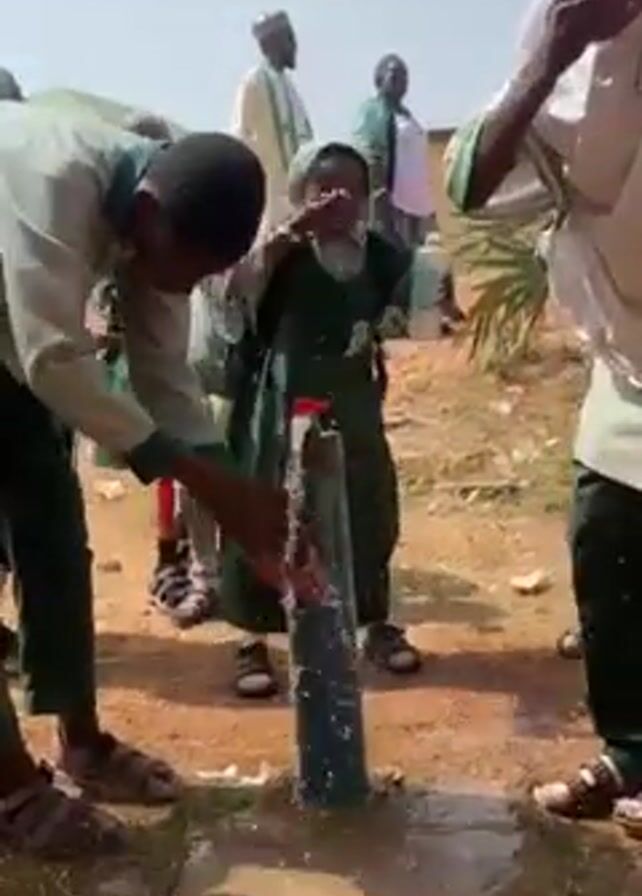 Several young people in matching green and white uniforms are gathered around a water spigot in an outdoor area. Two boys in the foreground are actively washing their hands under the running water. One child is drinking water from their hands at the spigot, while another holds a plastic water bottle and watches the handwashing. In the background, additional figures are visible, including adults in traditional attire. The ground appears to be a mix of dirt and sparse vegetation. A building can be seen in the distance.