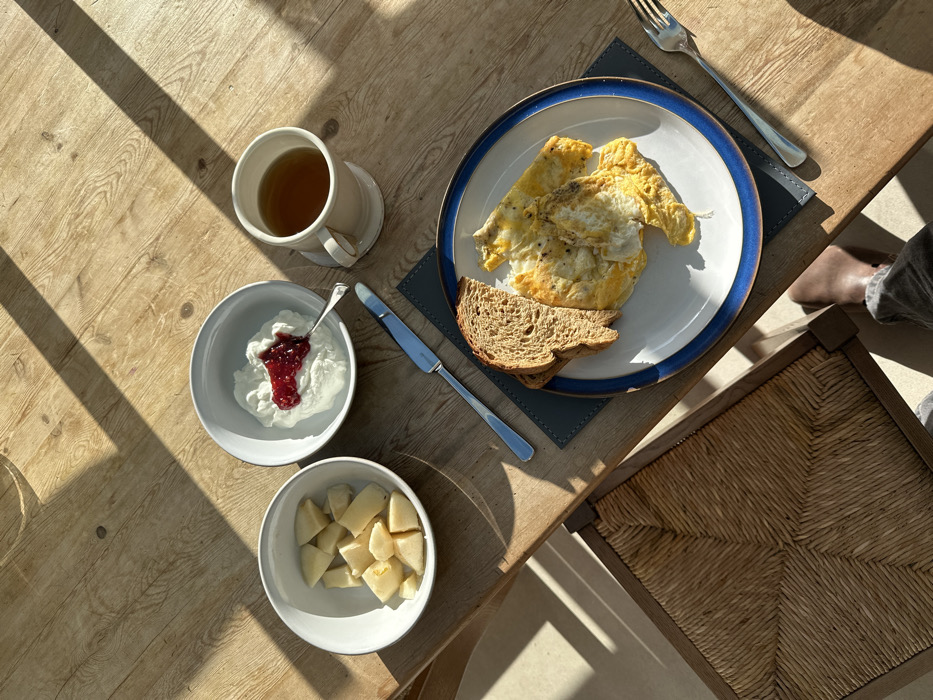 The image presents an overhead view of a breakfast setting on a light-colored wooden table, located in a residence within West Suffolk, United Kingdom. Strong, diagonal natural sunlight casts distinct shadows across the table surface, illuminating portions of the meal. On the table, from left to right, are several items: 1. A white ceramic bowl containing diced light-colored fruit, possibly apples or pears. 2. Adjacent to it, another white ceramic bowl holds a white creamy substance, likely yogurt or cottage cheese, topped with a spoonful of red fruit preserve. A small silver spoon rests within this bowl. 3. To the right, an off-white ceramic mug with a handle contains a dark amber liquid, consistent with tea. Below these items, centered on a dark grey rectangular placemat with visible stitching, is a white ceramic plate featuring a blue and brown rim. The plate holds two slices of dark brown toast and a portion of cooked eggs, visibly seasoned with dark specks, likely pepper. A silver butter knife is positioned horizontally between the creamy substance bowl and the plate, while a silver four-tine fork lies to the right of the plate. A second dark grey placemat is partially visible to the left of the plate. In the lower left quadrant of the image, a portion of a chair with a woven rush or straw seat is visible. In the lower right corner, the lower legs and feet of a person are visible beneath the table, wearing dark trousers and light brown, possibly leather, slip-on shoes, indicating an individual seated at the table.