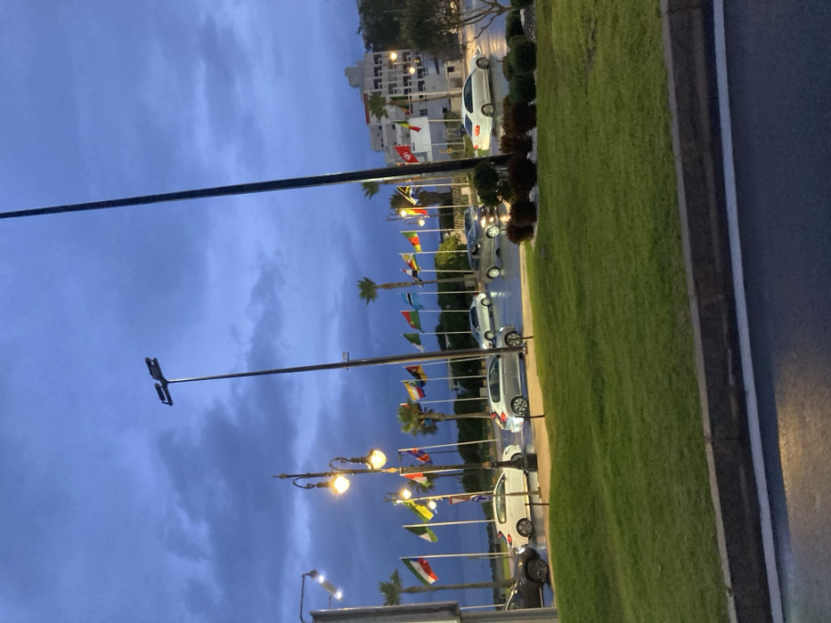A row of flags from different countries lines a street with parked cars, palm trees, and streetlights. A grassy area separates the flags from the road. A tall building stands in the distance. The sky above is cloudy and blue, suggesting it might be dusk or early evening. A tall pole dominates the left side of the frame.