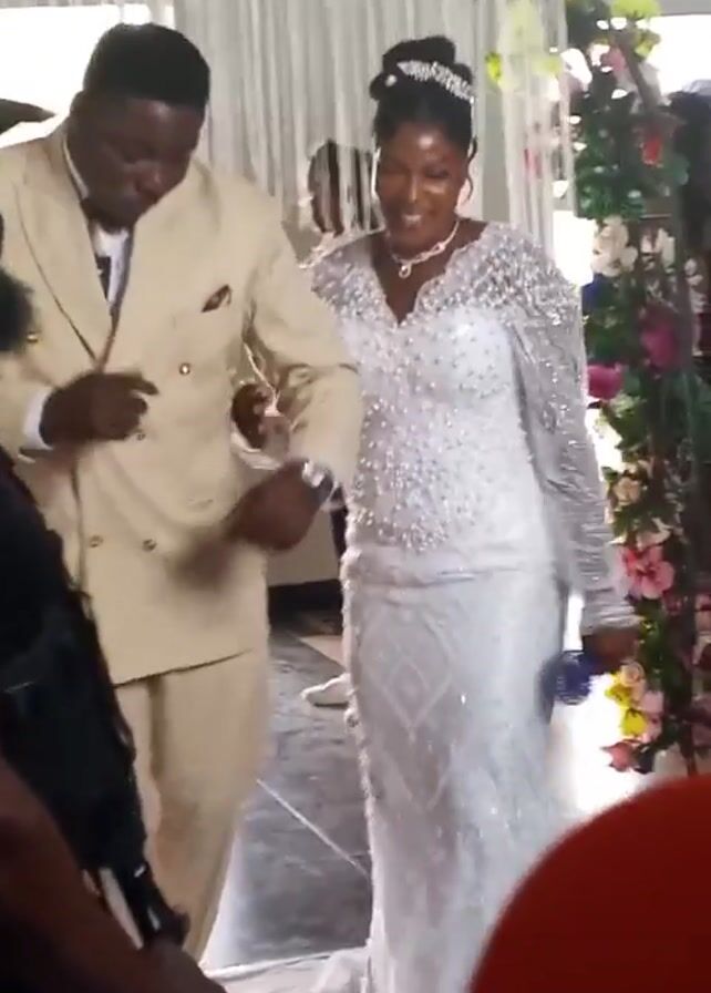 A man in a tan suit escorts a woman in a white, long-sleeved, embellished wedding dress down a decorated aisle. Both are smiling. Others are visible taking pictures.