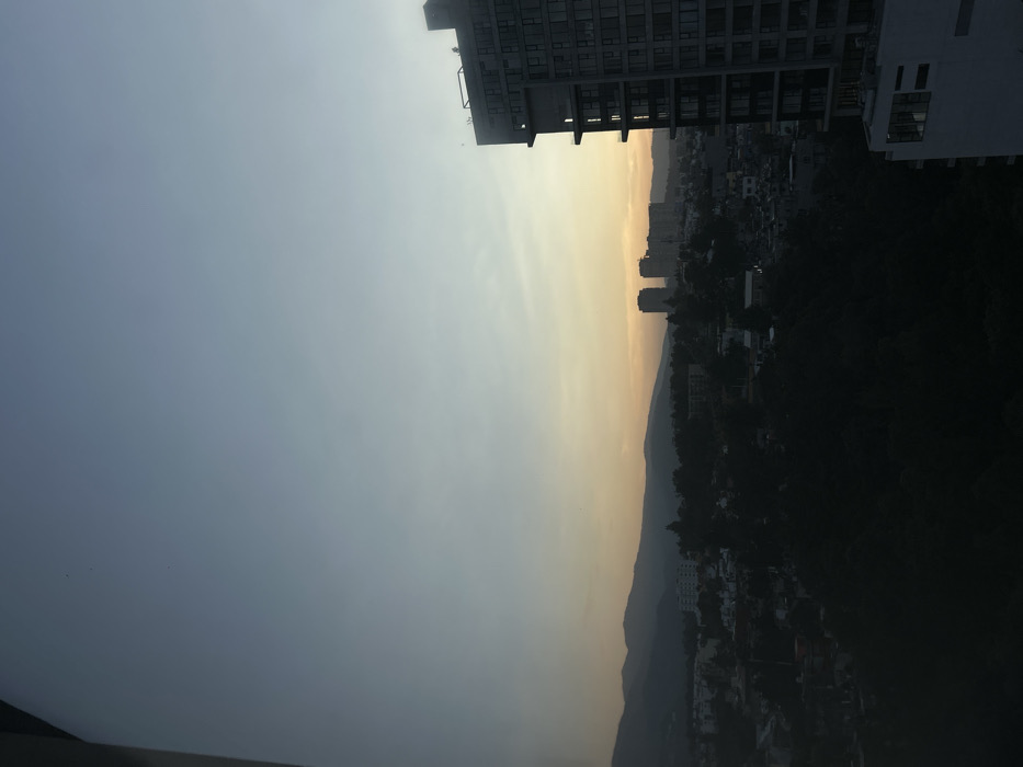 An urban skyline is framed by towering buildings on the upper edge of the view, set against a sky transitioning from dark gray to soft orange. Below, a darker area interspersed with buildings and trees suggests a hillside or a densely populated district. The image is rotated ninety degrees.