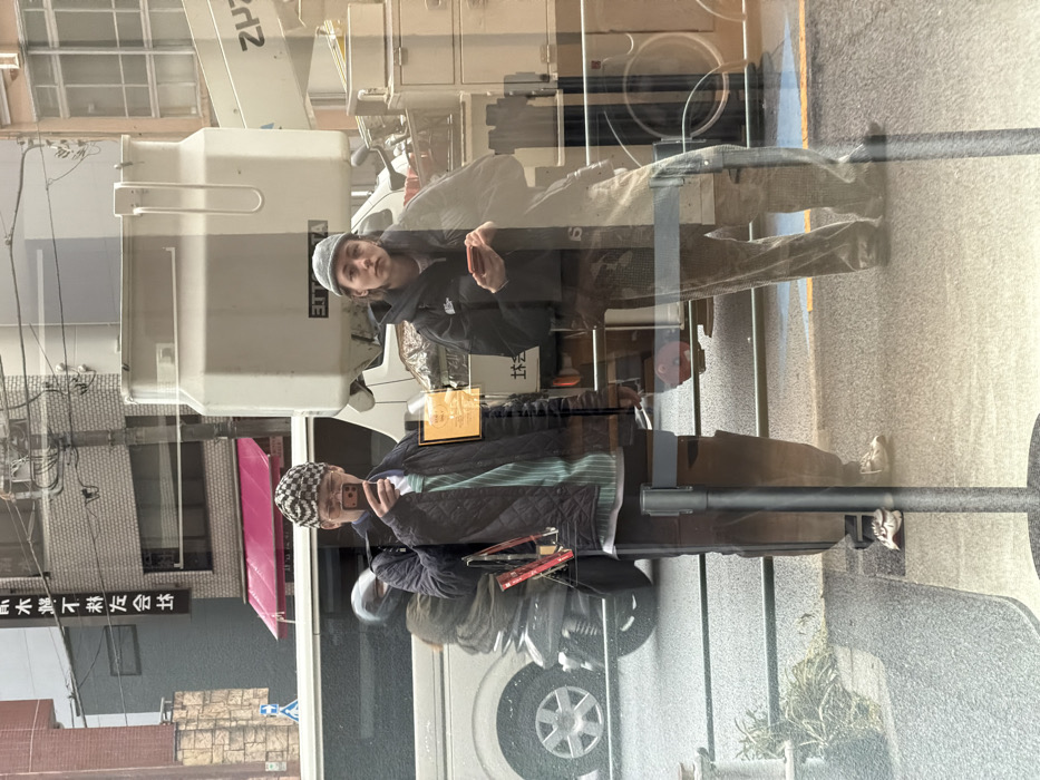 window reflection of two people. One person wears a beanie and a dark jacket, holding a phone. The other individual wears a checkered hat, glasses, and a quilted jacket, also holding a phone. The reflection captures a building, a crane-like vehicle, and street details. The angle of the reflection and street scene appears rotated, giving a surreal, layered impression. The reflection blends both the interior and exterior environments.