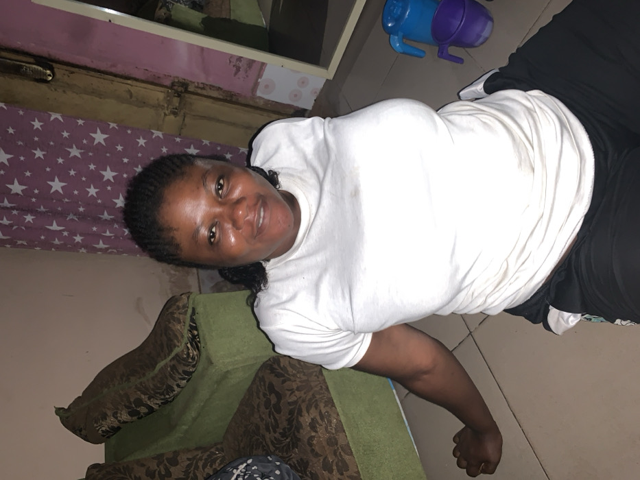 The image displays an adult female seated on a light-colored tiled floor within an interior residential setting in Akwanga, Nigeria