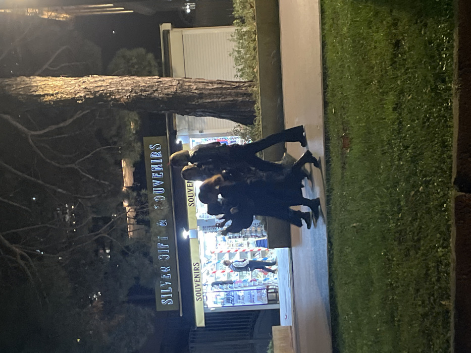 The image captures an outdoor night scene in Budva, Montenegro, depicting a brightly illuminated souvenir shop and pedestrians. A shop named "SILVER GIFT & SOUVENIRS" dominates the middle ground, featuring a prominent illuminated sign and bright interior lighting that displays various merchandise on shelves. Directly below the main sign, smaller banners also read "SOUVENIRS." To the immediate right of the shop stands a large tree with a textured trunk. Four individuals are walking from left to right on a paved path in front of the shop. The person at the front of this group, wearing a dark coat and possessing dark hair, holds a mobile phone elevated in their right hand, pointed towards the right, suggesting a photo or video capture. The other three individuals follow closely, also dressed in dark attire, their forms partially silhouetted against the shop's light. Inside the souvenir shop, a male individual wearing a light-colored top and dark pants is visible standing and browsing merchandise. In the foreground, a strip of manicured green grass is separated from the paved path by a low curb. The background beyond the shop and trees is dark, with faint lights indicating distant structures. The overall environment suggests an active commercial area during evening hours.