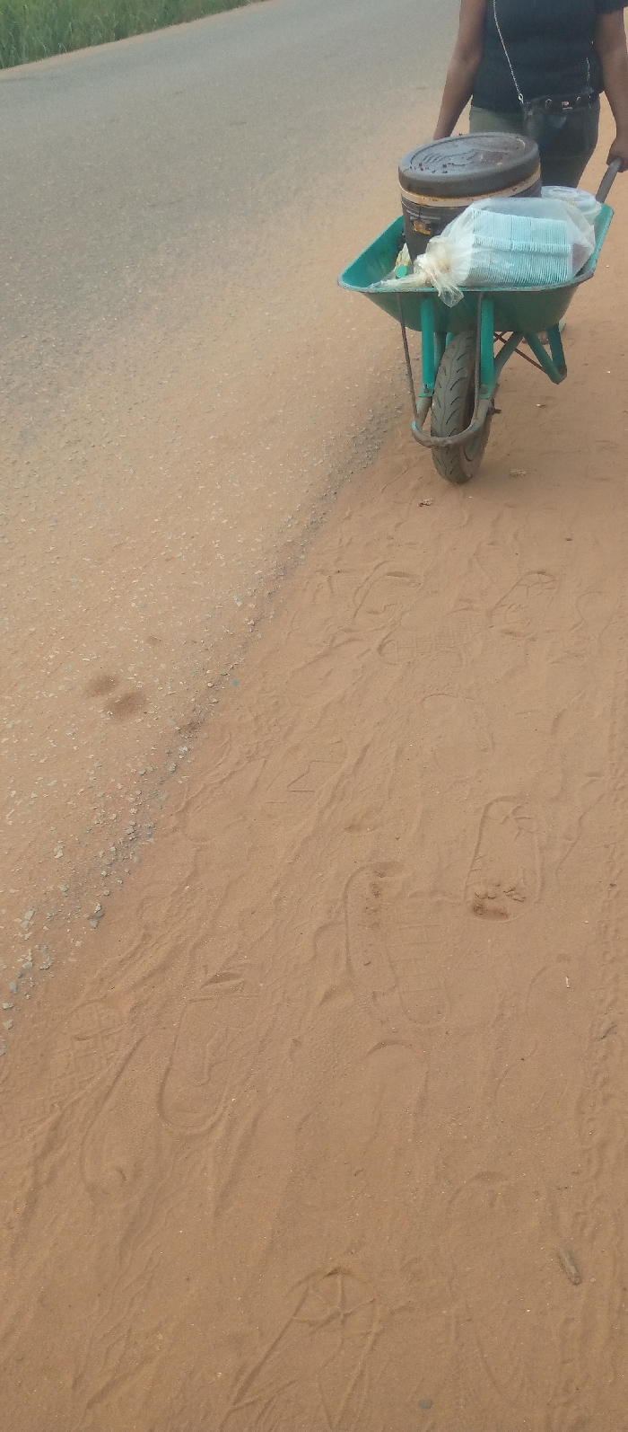 An overhead-angle image captures a scene on the side of a road in Nsugbe, Nigeria. The upper left of the frame features a paved, dark gray asphalt road. Adjacent to the road, occupying the majority of the frame, is a reddish-brown dirt or sandy verge, imprinted with numerous faint footprints and scuff marks. A single individual, partially visible from the chest down on the right side of the image, is pushing a teal-colored wheelbarrow. The individual wears a dark-colored, short-sleeved top and dark pants, with a small dark bag slung across their left hip. Both hands grasp the wheelbarrow's handles, indicating forward motion. The wheelbarrow's single front wheel, fitted with a black rubber tire, rests on the sandy verge. The wheelbarrow's basin contains two primary items: a large, dark-colored cylindrical container with a patterned lid, and a clear plastic bag filled with numerous light blue or white, elongated plastic objects, possibly combs. Green vegetation is visible at the extreme top edge of the paved road. The lighting is even, suggesting daylight without harsh shadows.