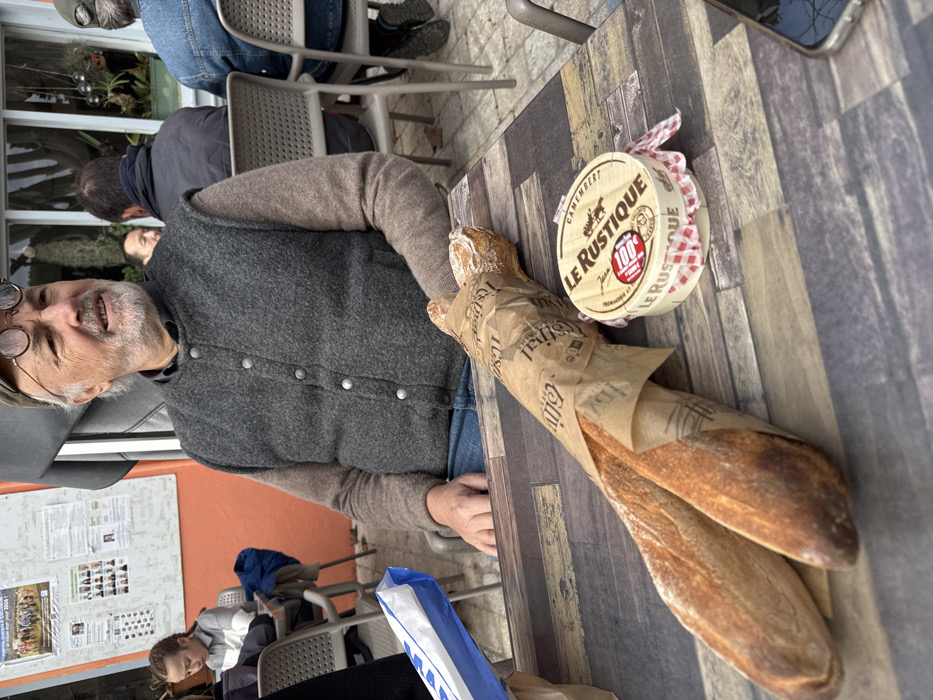 The image depicts an outdoor dining scene at a cafe in Cucuron, France. A man, approximately 60-70 years old with a grey beard, is seated at a rectangular table made of a material resembling dark wood planks. He wears a dark grey wool vest over a lighter brown long-sleeved shirt and blue jeans, with round spectacles perched on his head. He is looking off to the right, slightly upward, with a faint smile. His left hand rests on the table. On the table in front of him are two baguettes, partially wrapped in brown paper bearing the text "L'Estival" and other French words. To the right of the baguettes is a round, wooden box of "LE RUSTIQUE CAMEMBERT" cheese, wrapped in a red and white checkered cloth. A small blue and white paper bag is visible to the far left on the table. A smartphone, partially visible, rests on the table's bottom right corner. In the background, other patrons are seated at similar outdoor tables. To the left, a young girl with dark hair, wearing a striped top, is visible. Behind her, a white bulletin board with several printed posters, some featuring small photographs, is affixed to an orange wall. To the right of the man, another patron is visible from behind, wearing a dark jacket, and further right, another person in a denim jacket. A building with large glass windows and hanging plants is visible behind these patrons. The ground beneath the tables appears to be paved.