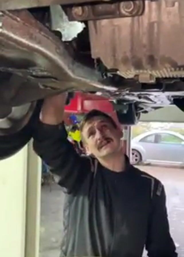A mechanic with a mustache works on a car in his garage