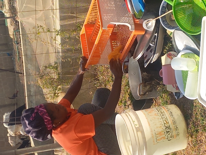 In Agingi Zion, Nigeria, an adult female is observed outdoors, actively engaged in washing dishes