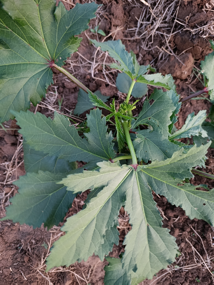 - "A close-up, top-down view of a young okra plant (Abelmoschus esculentis) rooted in dry, brown, clumpy soil in Vanga ward, Kenya" by FM-d4PGJ2, licensed under CC BY 4.0