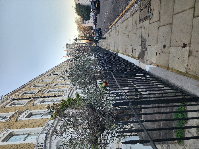 This image displays a quiet residential street scene within the city of London, United Kingdom, under a pale, overcast sky. In the foreground, a black wrought-iron fence with spear-top finials runs parallel to the viewer, supported by a low white concrete wall. Behind the fence, a strip of ground contains several deciduous shrubs and trees, mostly bare of leaves, with some small patches of green vegetation visible at the base. To the right of the fence, a paved sidewalk composed of light grey rectangular stone slabs extends into the distance, exhibiting minor staining, cracks, and scattered dry leaves. Two square metal utility covers are embedded in the sidewalk pavement. To the left, a long row of multi-story terraced residential buildings lines the street. These structures feature light yellow-beige brick or painted stucco facades, with numerous white sash windows. Many windows are adorned with ornate white surrounds and sills, and several have white decorative balustrades or balconies. The street, a tarmac road with a yellow curb marking, runs to the right of the sidewalk. Multiple passenger vehicles, predominantly dark in color, are parked along the street further down. A black streetlamp with a single light fixture stands on the right side of the sidewalk in the midground. The background shows additional buildings and bare trees. No individuals or active subjects are present in the scene.