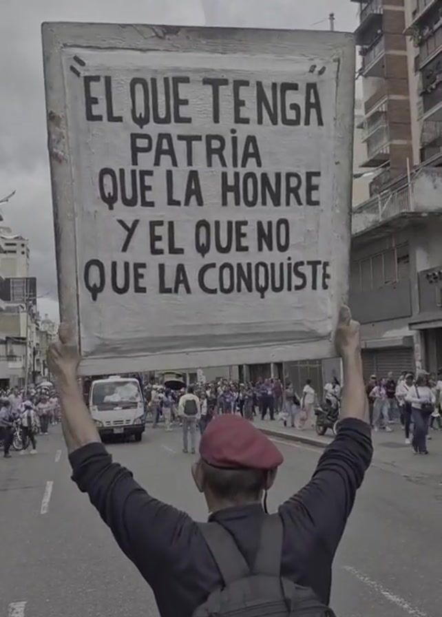 man from the back holding up a large sign at a protest. The sign is painted white with black text in Spanish. The text reads “EL QUE TENGA PATRIA QUE LA HONRE Y EL QUE NO QUE LA CONQUISTE.” The man is wearing a black jacket, a red beret, and a black backpack. He has his arms raised to hold the sign. A crowd of people is visible in the background, walking in the same direction on the street. There are also cars and motorcycles on the street. Buildings line the sides of the street. The sky is overcast. The video is taken at street level and is slightly shaky.