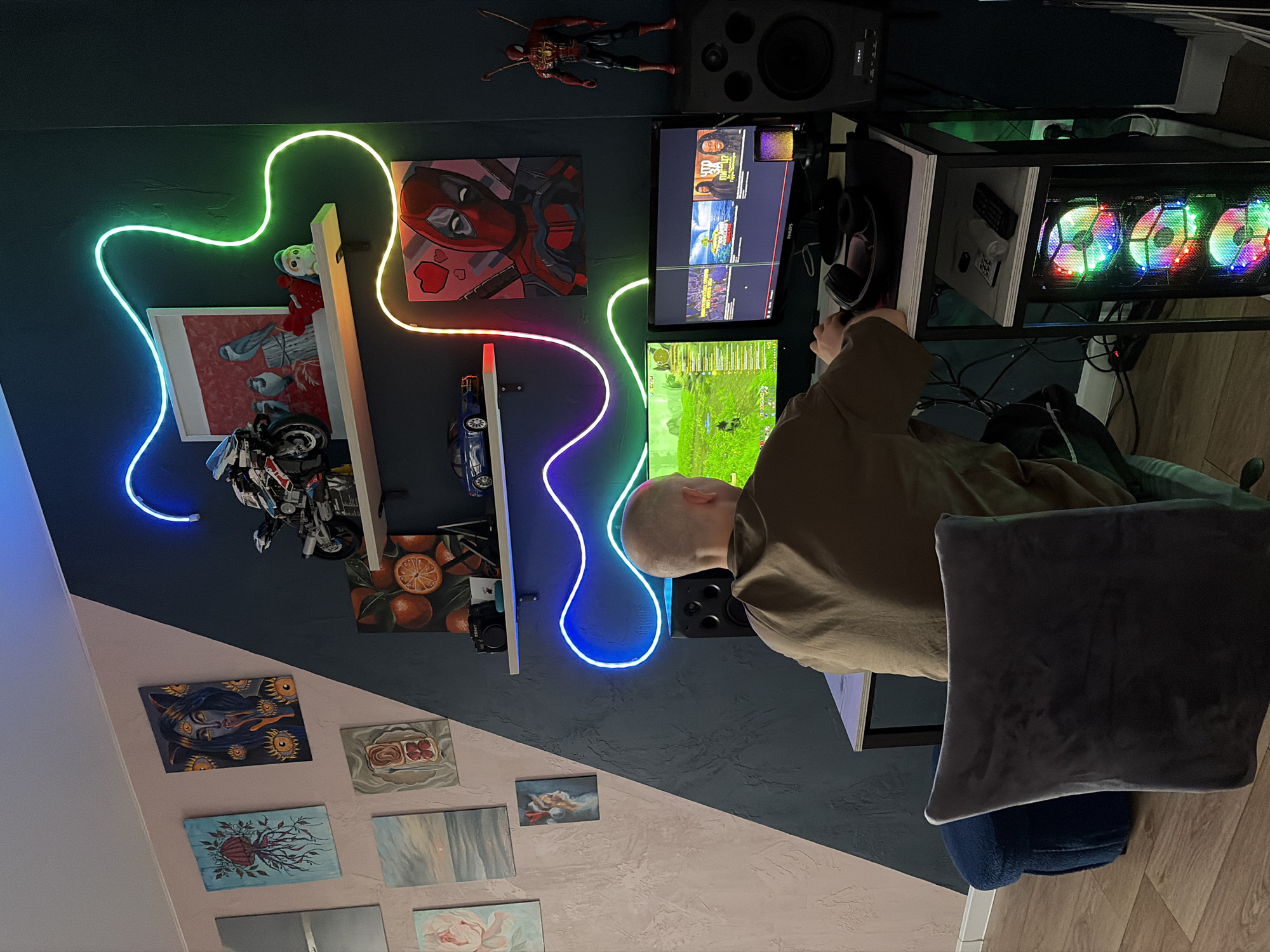 A person is seated in a room with a gaming setup. The room features a two-tone wall, dark blue above and light pink below, meeting at a diagonal. The dark blue portion of the wall is adorned with several paintings, a colorful neon light in a looping pattern, and shelves containing toys, models, and a painting of oranges. Above the monitor are a Spider-Man action figure and a speaker. The gaming setup includes two monitors displaying computer game content, a gaming PC with colorful RGB lighting, and a headset. The person is seated in a chair with a pillow, facing the gaming setup. The location is Rostov-on-Don, Russia, though the specific area is not identifiable from the image.