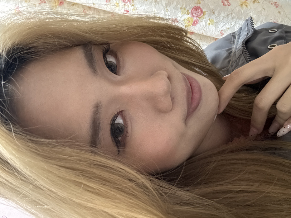 A close-up portrait of an East Asian female is depicted in an indoor setting within Shapingba District, China. The subject, positioned centrally, has long, light brown hair with visible darker roots and gazes directly forward with a subtle, closed-mouth smile. Eyeliner with a winged design is applied, and her eyes appear to be enhanced with grey-colored contact lenses. Her right hand is visible on the lower left of the frame, with the index finger resting gently beneath her chin; her fingernails are manicured with a light base and small dark polka dots. She is attired in a grey garment, visible on her right side (viewer's left), featuring a zippered detail and silver-colored eyelets. The background consists of a light-colored fabric adorned with a repeating floral pattern of pink and red roses and green leaves, consistent with a curtain or tapestry.