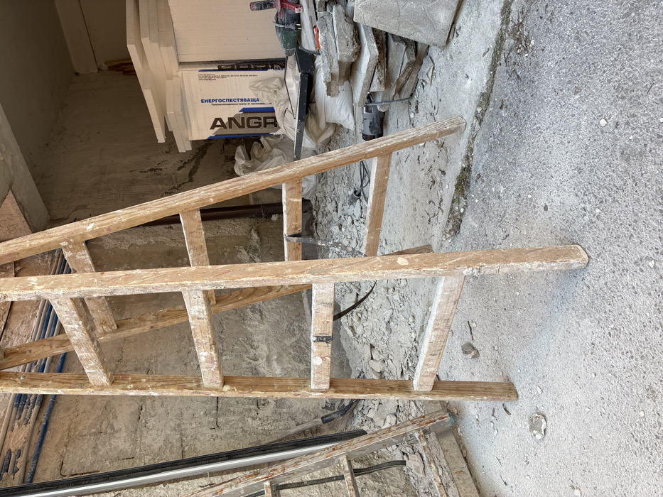 This image captures a static outdoor or semi-outdoor construction and renovation site in Sofia, Bulgaria. A central, A-frame wooden ladder, discolored and heavily coated with white residue (likely paint or plaster dust), stands on a coarse concrete surface. The ground beneath is uneven, featuring cracks and dark organic growth, all partially obscured by a thick layer of light grey dust and assorted small concrete debris. To the left of the prominent ladder, a second, older wooden ladder, partially visible, leans against a textured concrete wall. Behind it, a black shovel and other long tools are propped. Blue utility pipes are affixed horizontally along the upper portion of this concrete wall. The right side of the background displays a recessed area or alcove with similar rough concrete walls. Several large white bags or packages, bearing Cyrillic text including "ЕНЕРГОСПЕСТЯВАЩА" (energy-saving) and a partial brand name "АНГР," are stacked. The ground in this section is cluttered with a black plastic tray, various plastic bags, a green corded power drill, additional power tools, and smaller implements. A stack of irregularly shaped, flat stone slabs is positioned to the right. No individuals are present in the scene.