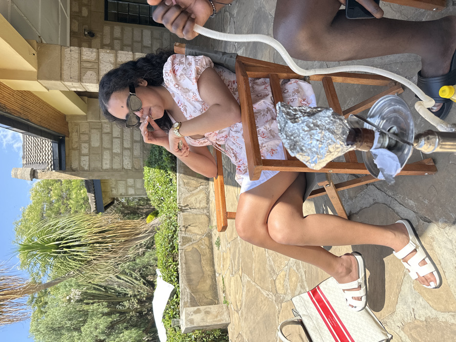 The scene depicts two individuals engaged in leisure activities on an outdoor stone patio in Olkaria ward, Kenya, under a clear daytime sky. A woman, with dark curly hair and wearing dark sunglasses, a light-colored floral short-sleeved top, white shorts, and white flat sandals, is seated in a wooden-framed canvas chair. Her legs are crossed at the knee. She holds a small, slender object to her mouth with her right hand; a gold-colored watch is visible on her left wrist. To her right, a second person, identified by dark skin tone and wearing black slide sandals and dark shorts, is partially visible. This individual holds a white flexible hose from a hookah with their right hand, while their left hand holds a smartphone. A silver-colored hookah, with its bowl covered in aluminum foil, is positioned on the stone patio floor between the two individuals. To the left of the woman's feet, a white tote bag with red stripes and "GUESS" branding rests on the patio. In the background, a light-colored stone building with a dark tiled roof and wooden eaves is visible, accompanied by lush green vegetation including palm-like trees, cacti, and shrubs. A clear glass containing liquid is placed on a low stone wall to the left of the woman.