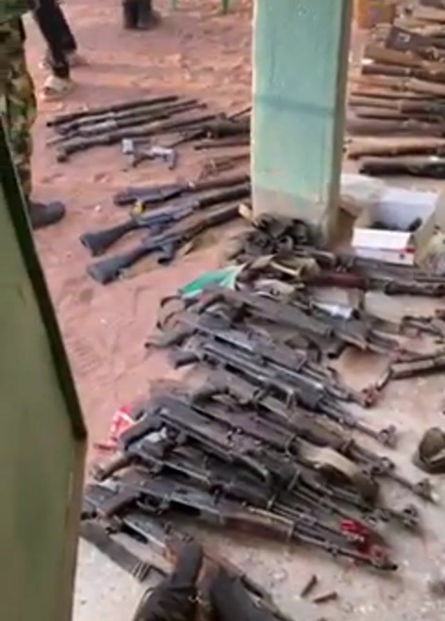 collection of weapons spread out on the ground. There are many AK-47 style rifles piled in the center, along with magazines. Several shotguns are also visible on the left side. In the background, there is a larger group of what appear to be older hunting rifles or muskets. A person wearing camouflage pants walks briefly into the frame from the right. The scene appears to be outdoors, on a dirt or concrete surface, partially covered by a roof or overhang. A green plastic chair sits in the background.