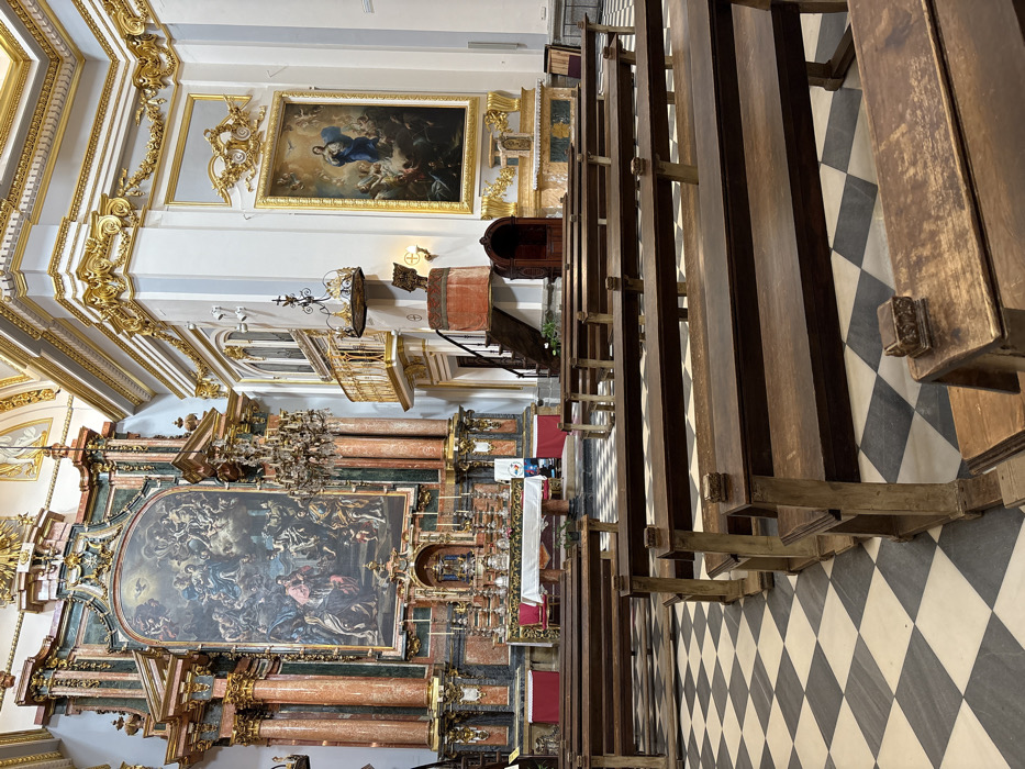 The image depicts the interior of a grand, ornate church or basilica, likely the Royal Chapel within the Royal Palace of La Granja de San Ildefonso, located in San Ildefonso, Spain. The perspective is from the nave, looking towards the altar. The floor is covered in a black and white checkered marble pattern, laid diagonally. Multiple rows of dark wooden pews with plain, unadorned designs are visible, extending from the foreground towards the rear of the nave. All pews are unoccupied. At the far end, the main altar is dominated by an elaborate, towering Baroque reredos. This structure features large columns of polished reddish-brown marble with gilded capitals and bases, framing a central, large vertical oil painting depicting a complex religious scene. The painting's lower half shows numerous figures in period attire, while the upper half portrays celestial beings and angels amidst clouds, with a divine figure at the apex. The reredos also incorporates green marble accents and extensive gold ornamentation. In front of the reredos, the altar table is draped in a white cloth with red fabric underneath, holding multiple candlesticks, candles, and religious vessels, including a central tabernacle or monstrance. To the right side of the nave, the walls are light gray, adorned with intricate gold leaf ornamentation, including garlands, scrolls, and decorative moldings. A large, vertically oriented oil painting hangs on the right wall, framed in gold, depicting the Virgin Mary in blue and white robes, ascending or enthroned among clouds and cherubs, with a dove above. Below this painting, a smaller, ornate altar or shrine is visible. A prominent wooden pulpit is situated on the right, accessed by a curved wooden staircase. The upper portion of the pulpit is covered in reddish-orange velvet-like fabric, topped with a decorative crown-shaped canopy. Directly below the pulpit, a dark wooden confessional booth with an arched entrance is present. Above and to the left of the pulpit, a small, ornate golden balcony with a wrought-iron railing projects from the wall. A multi-tiered crystal chandelier hangs from the high ceiling, positioned between the pews and the altar, to the right of the central reredos. Additional lighting is provided by ornate golden wall sconces with electric candle-like bulbs. The ceiling appears to feature vaulted sections with gold ornamentation. The entire scene is devoid of human subjects.